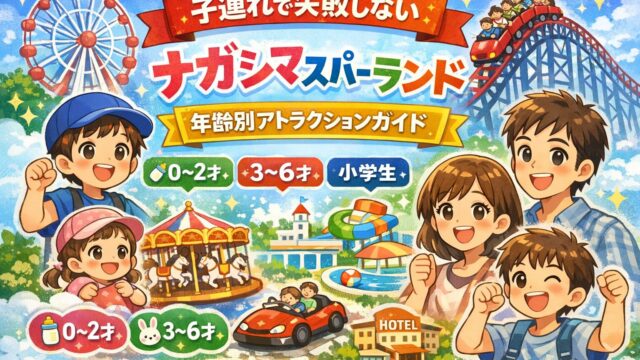 子連れでナガシマスパーランドに行くなら必読。0〜2才・3〜6才・小学生の年齢別におすすめアトラクションを厳選。失敗しない回り方とホテル比較も解説します。